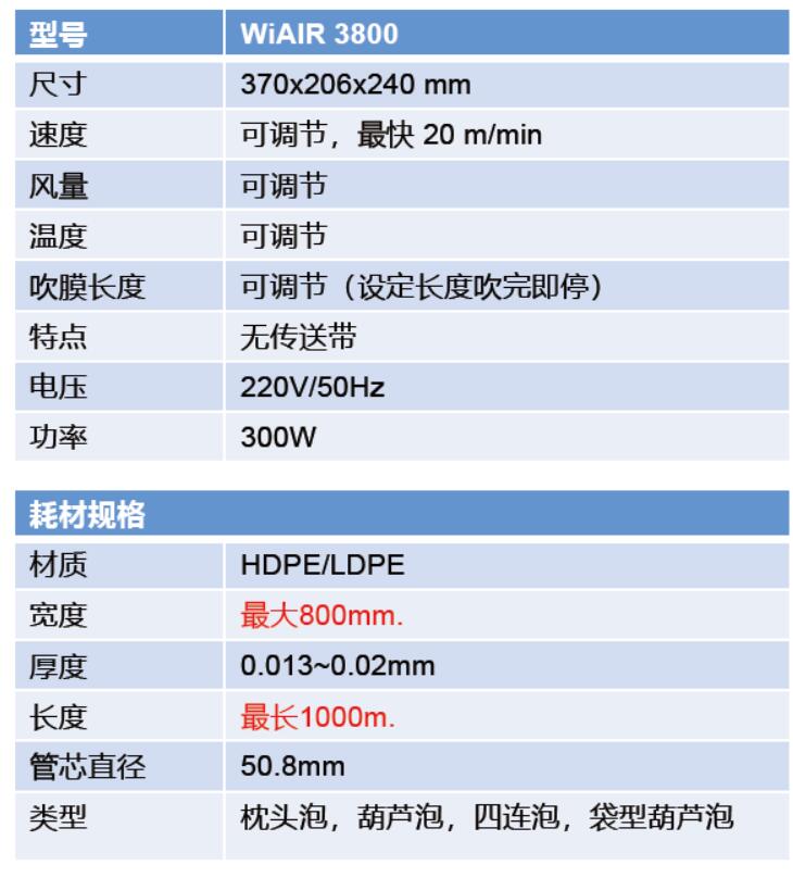 WiAIR 3800 可以吹枕頭泡,葫蘆泡,四連泡和袋型葫蘆泡;可以用于各種需要填充空間或者包裹物品的情景使用,例如:醫療用品,化妝品,數碼電子產品,書本,食品類,箱包,易碎品等。