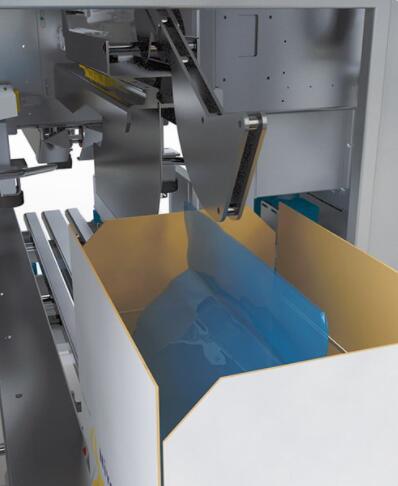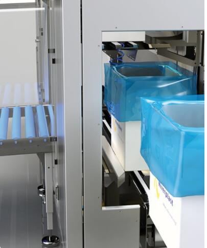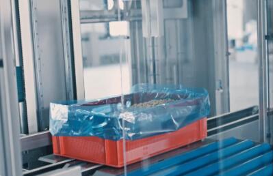 箱子朝密封單元抬起。在這里,兩個真空夾具從箱子的短邊撿起袋子。