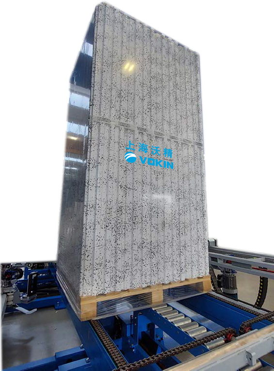 套袋過程過程中還包括一個外形輪廓控制系統(tǒng),它根據(jù)跺型的實際尺寸自動調(diào)整薄膜位置,保持薄膜拉伸力的平衡。